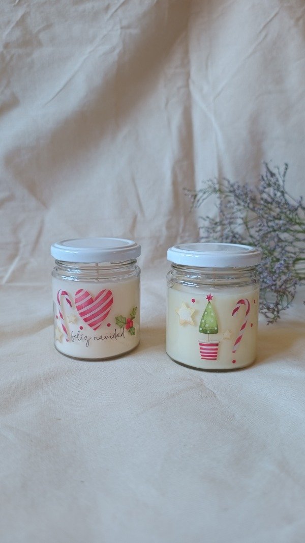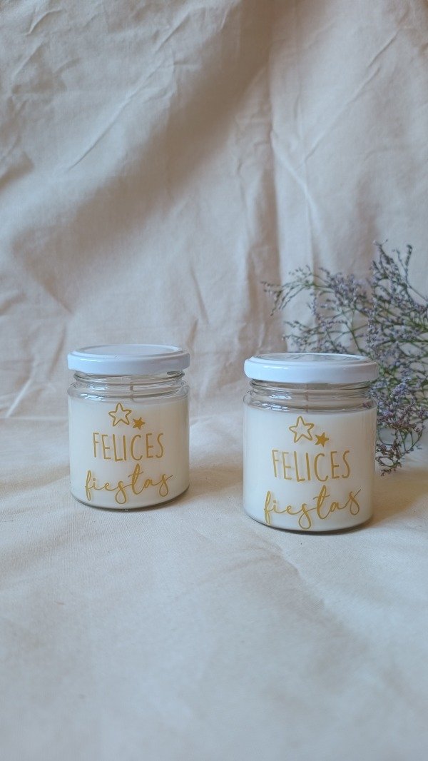 Vela aromática en frasco de vidrio con tapa. Se puede elegir entre el diseño "Felices Fiestas" o con dibujo.